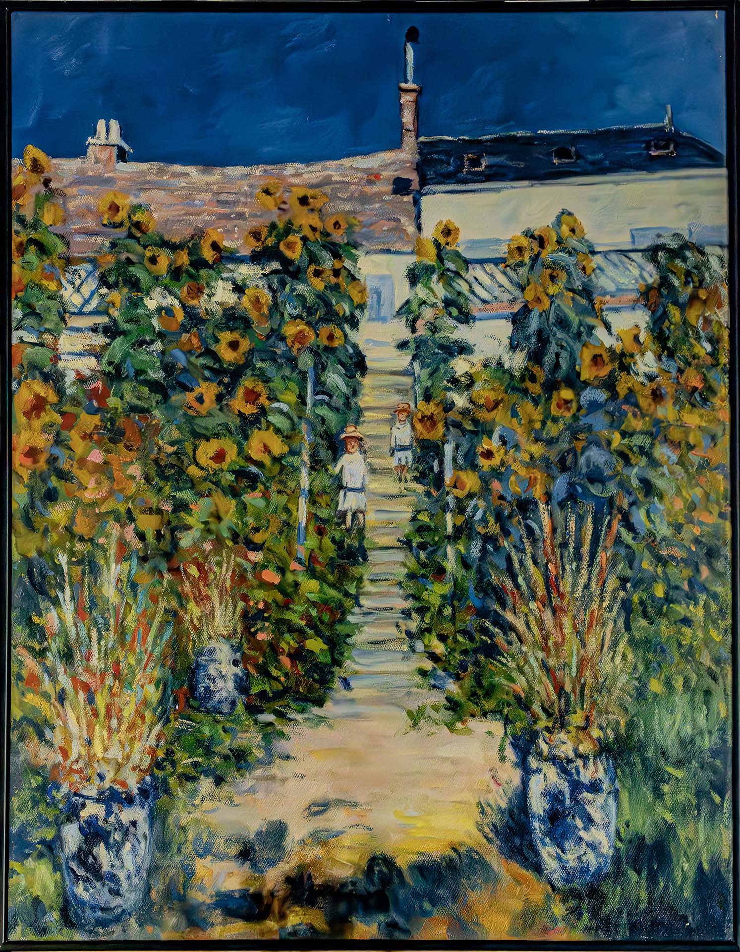 The Artist's Garden at Vétheuil, 1881. Monet planted gardens wherever he lived. When he rented this house at Vétheuil, he made arrangements with the owner to landscape the terraces, which lead down to the Seine. The boy with the wagon is Monet's young son, and on the steps behind him are other members of his extended household. -nga.gov