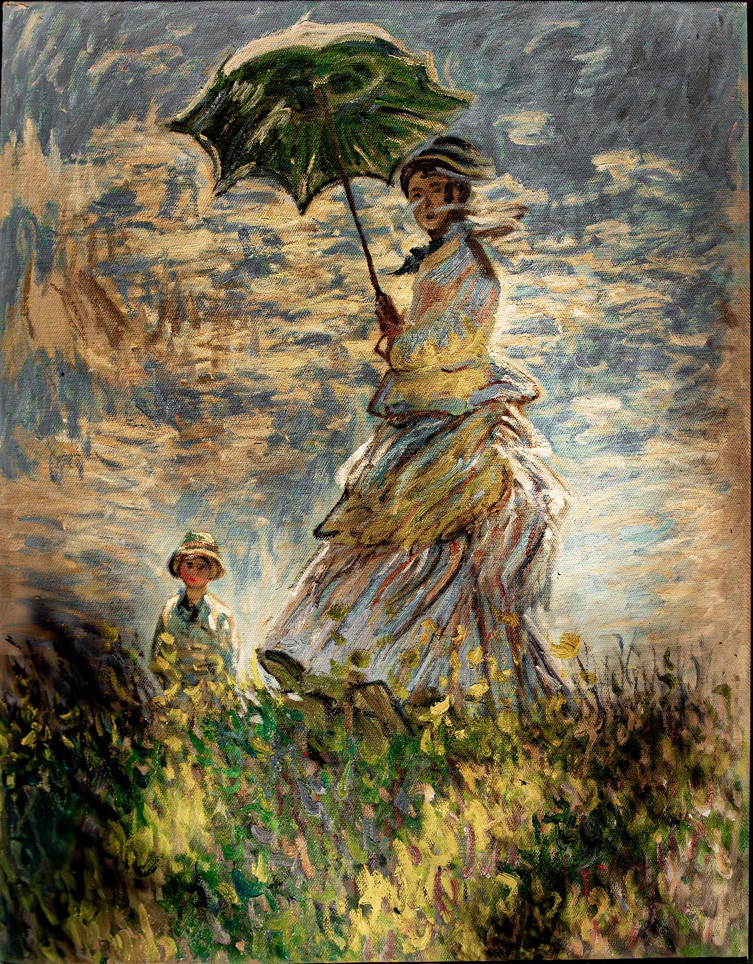 Woman With a Parasol - Madame Monet and Her Son by Claude Monet. Also known as The Stroll, Woman With a Parasol - Madame Monet and Her Son is an oil-on-canvas painting created by Claude Monet in 1875. The Impressionist piece depicts Monet's wife Camille Monet and their son Jean Monet, capturing a moment on a stroll on a windy summer's day. The painting is arguably one of Monet's most notable and highly revered artworks, and it received praise when it appeared in the second impressionist exhibition in 1876. Monet wanted to convey the feeling of a casual family outing and not a formal portrait. -owlcation